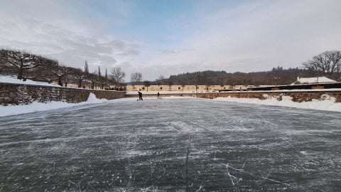 Bruslaři si na zmrzlém příkopu zámku zajezdí tento víkend ještě jednou v neděli od 16 do 18 hodin. Přímo na ledě jim k tomu zahraje kapela Bonsai č. 3.